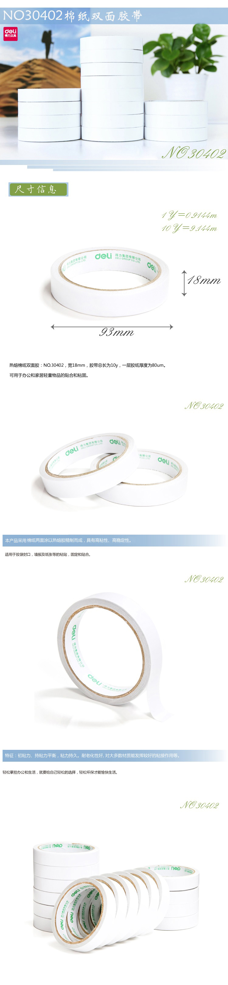 得力 30402 棉紙雙面膠帶 18mm*10y*80um 白色 按卷銷售