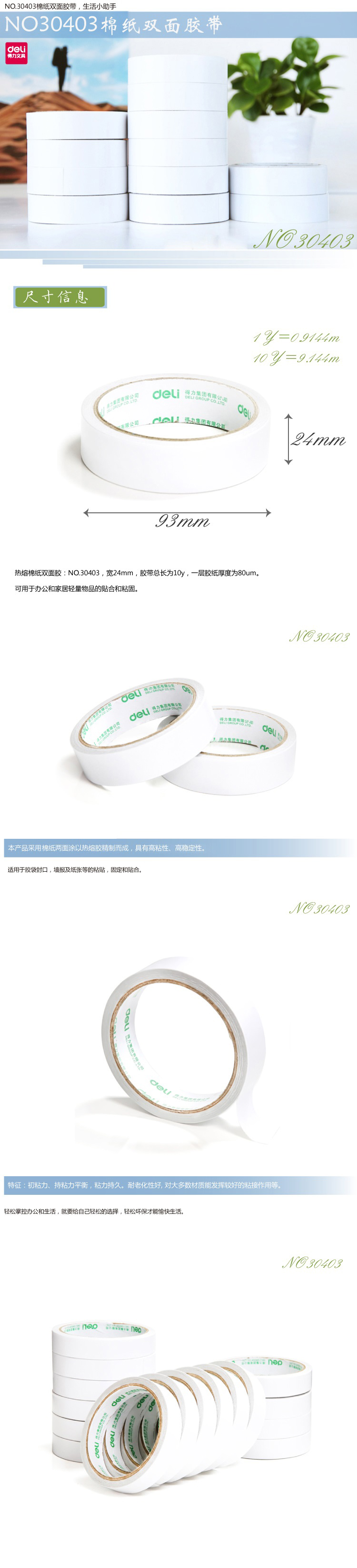 得力 30403 棉紙雙面膠帶 24mm*10y*80um 白色 按卷銷售