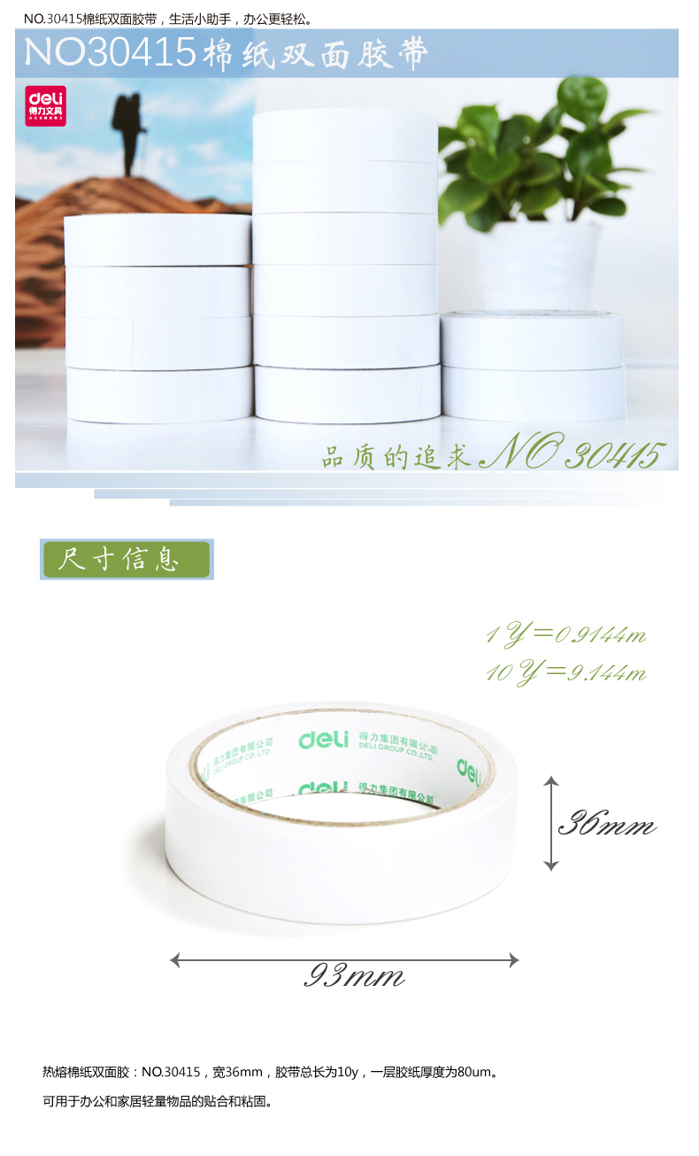 得力 30415 棉紙雙面膠 36mm*10y*80um 白色