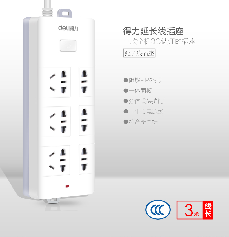 得力 18256 單控六聯(lián)接線板插座 3米 白色