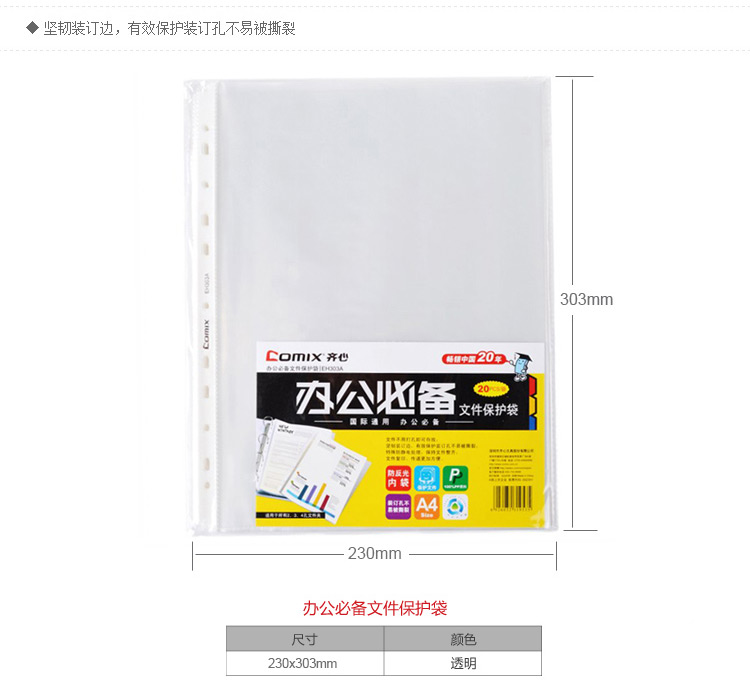 齊心 EH303A 11孔文件保護袋 透明色 20個/包
