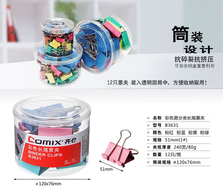 齊心 B3631 彩色長尾票夾 50mm 24只/筒