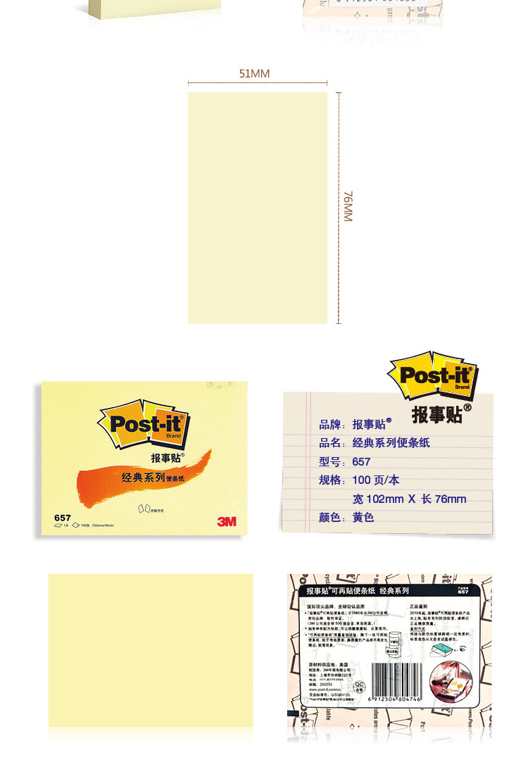 3M 657 報事貼便條紙 102*76mm 黃色 100張/本