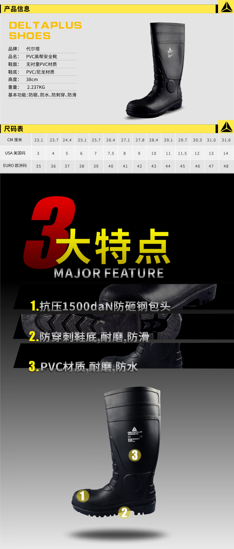 代爾塔 301407 防砸/防刺/防水/穿耐酸堿高筒防化靴 42碼