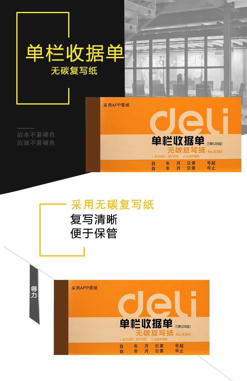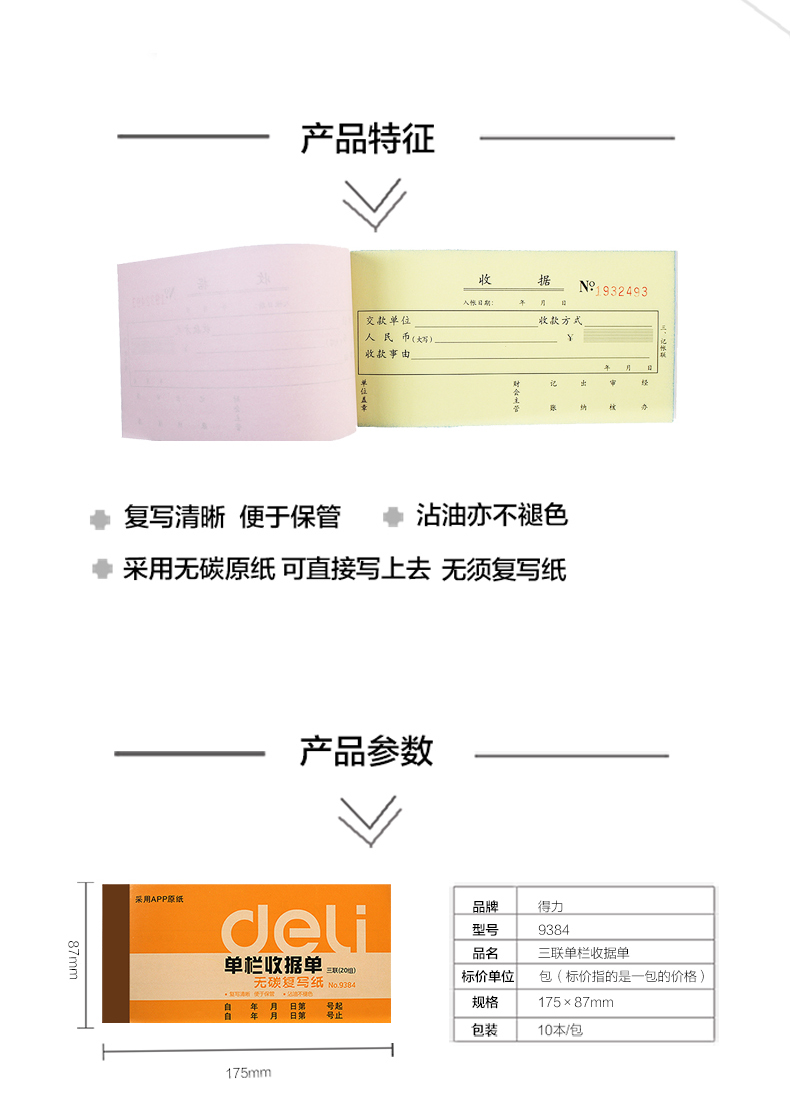 得力 9384 三聯(lián)無碳單欄收據(jù) 87*175mm