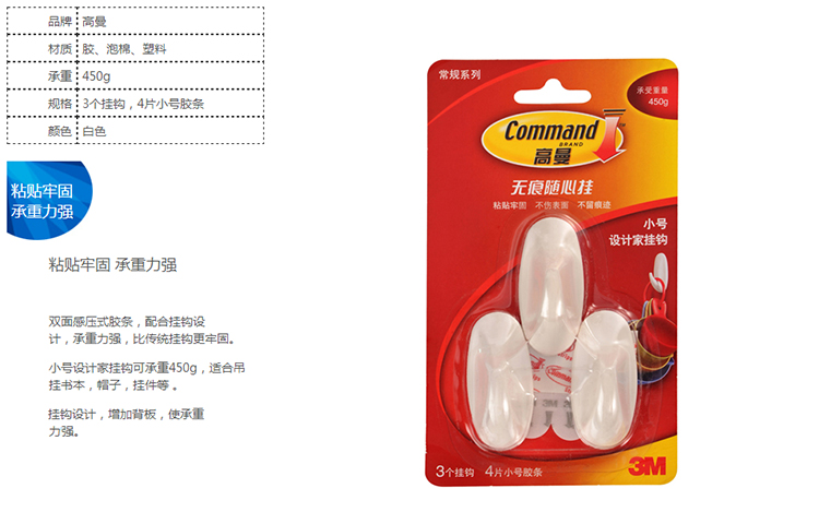 3M 高曼設(shè)計(jì)家系列無痕掛鉤 小號(hào) 3個(gè)裝