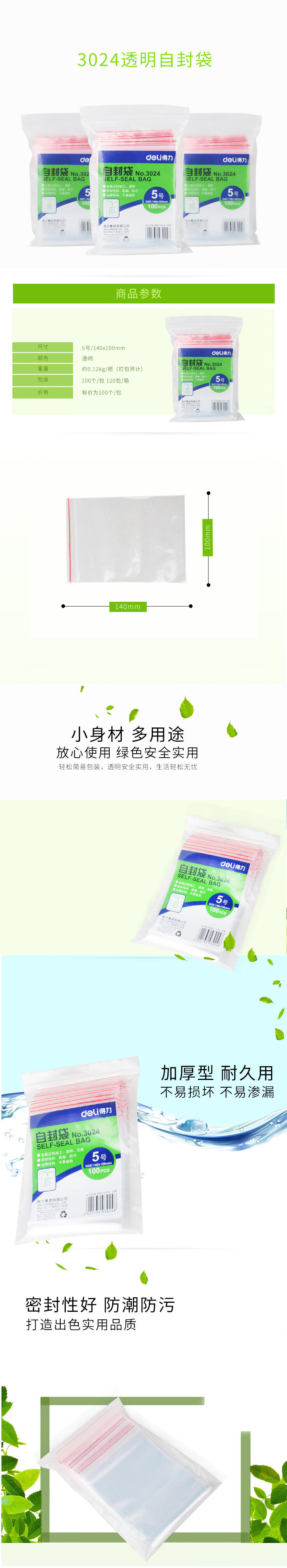 得力 3024 自封袋 5號(hào) 透明 100個(gè)/包 140x100mmx0.04mm