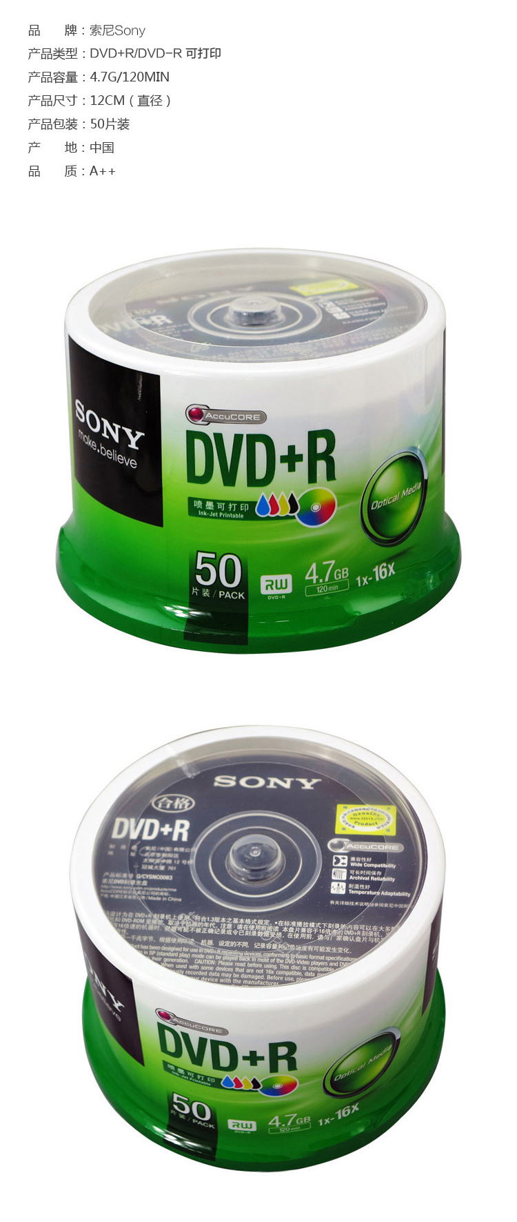 索尼 DVD+R 光盤/刻錄盤 16速 4.7G(50片裝)