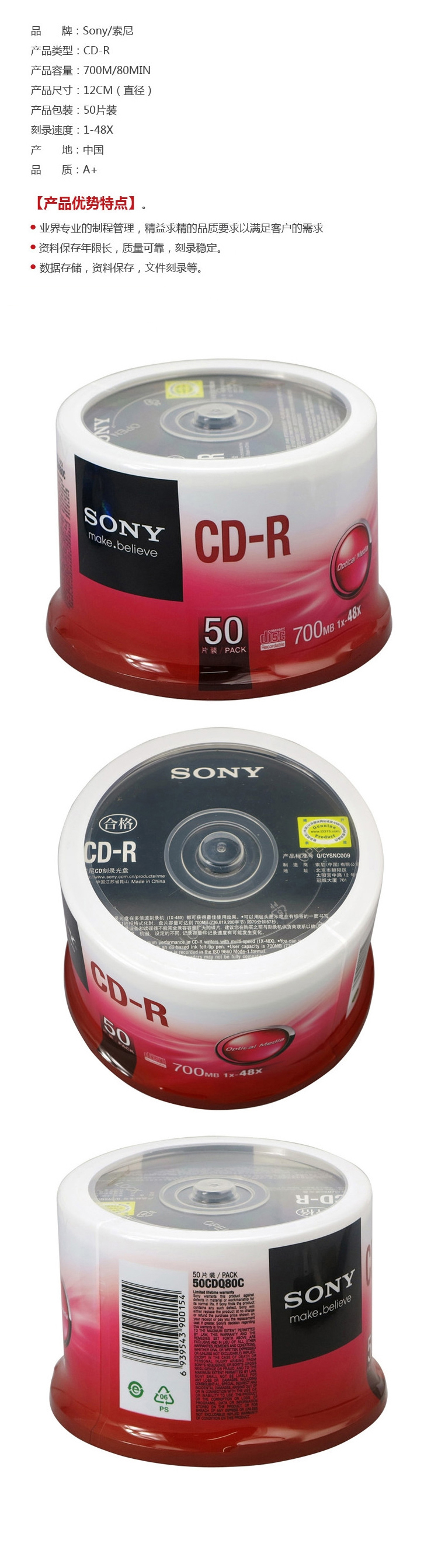 索尼 CD-R 光盤/刻錄盤 48速 700MB(50片裝)