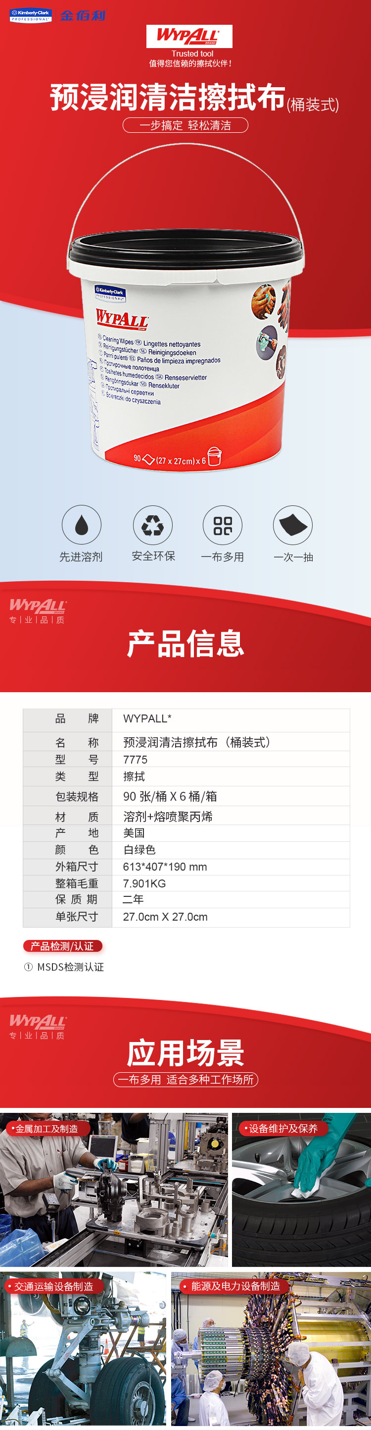 金佰利 7775 預(yù)浸潤清潔擦拭布 90張/桶 6桶/箱 綠色