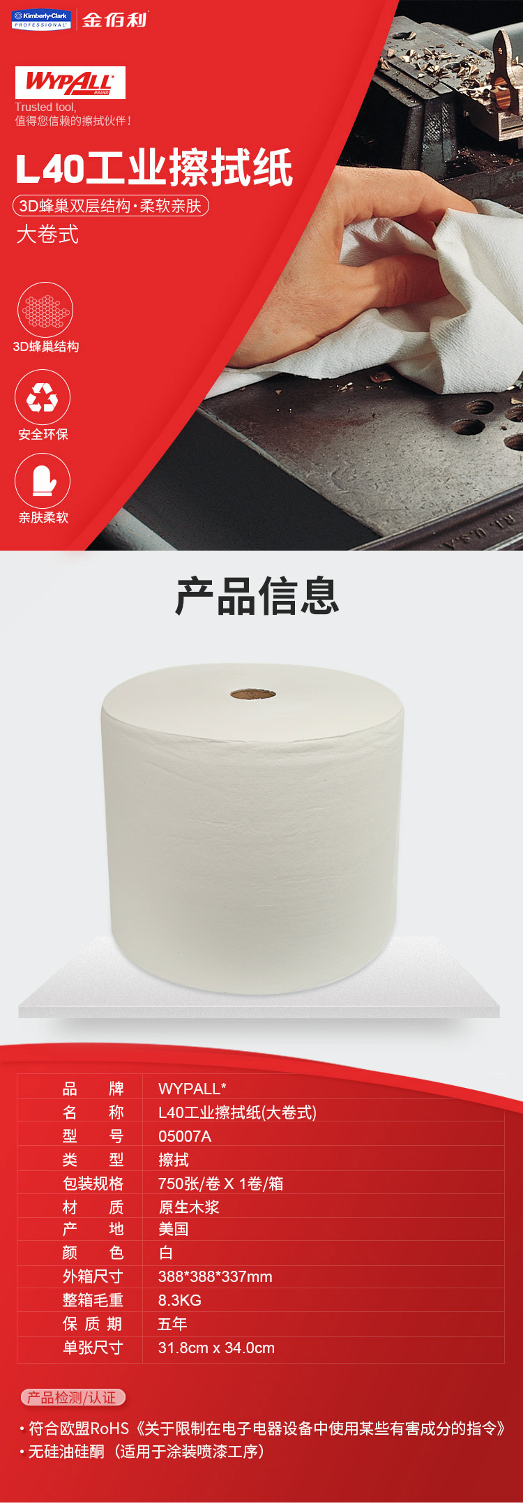 金佰利 05007A 工業(yè)擦拭紙勁拭L40大卷式 750張/卷 1卷/箱