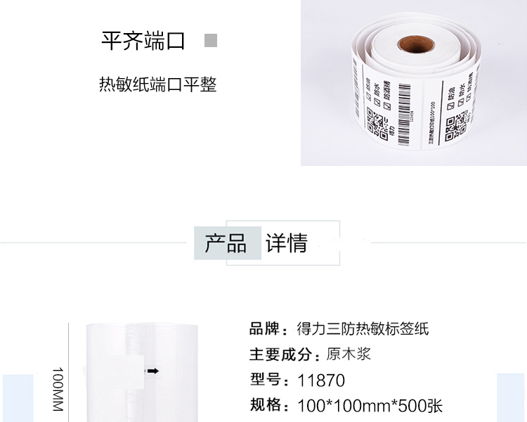 得力 11870 三防熱敏標(biāo)簽紙 100*100mm 白色 500張/卷