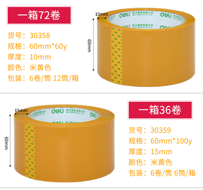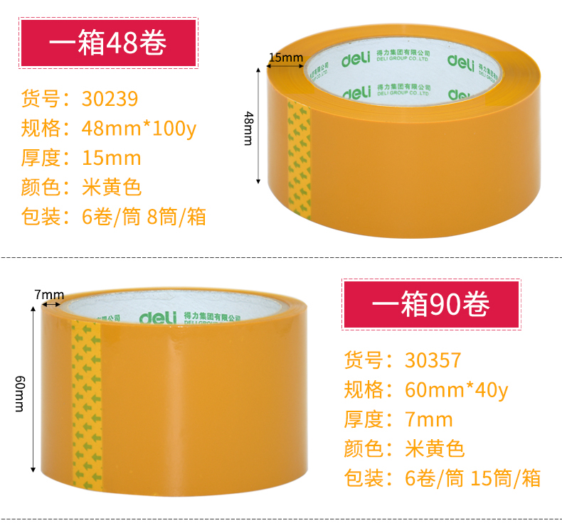 得力 30238 封箱膠帶 48mm*60y 米黃色 6卷/筒