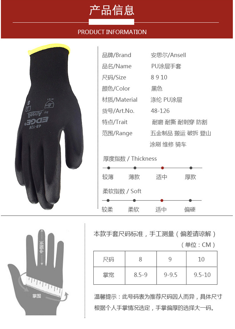 安思爾Ansell 48-126 滌綸PU涂層手套 9碼 黑色 12副/打 12打/箱