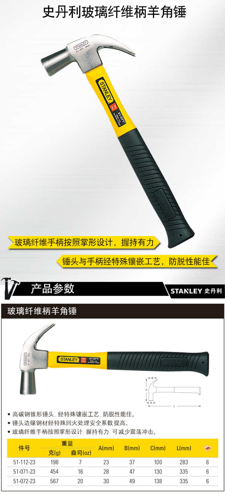 史丹利Stanley 51-071-23 玻璃纖維柄羊角錘 16oz