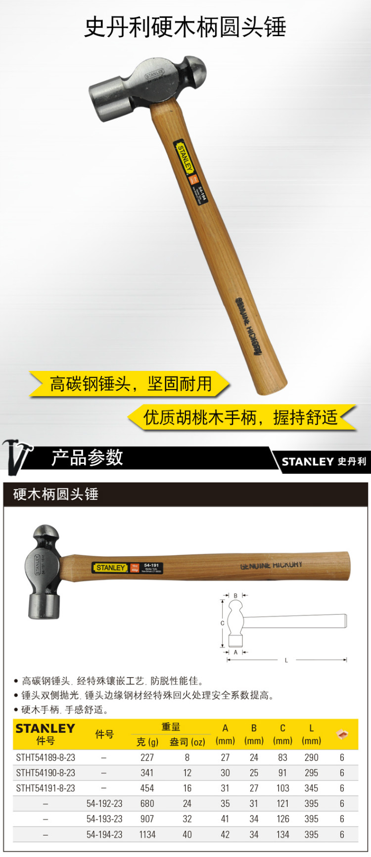 史丹利Stanley STHT54190-8-23 硬木柄圓頭錘 12oz