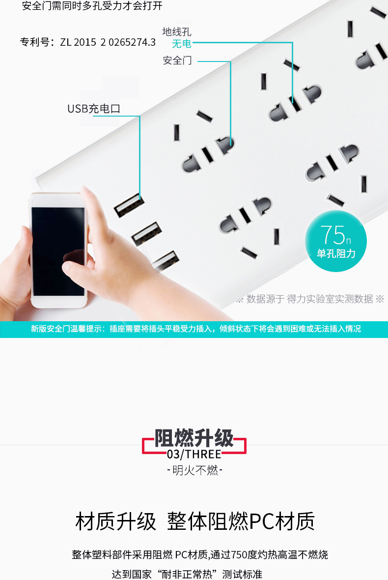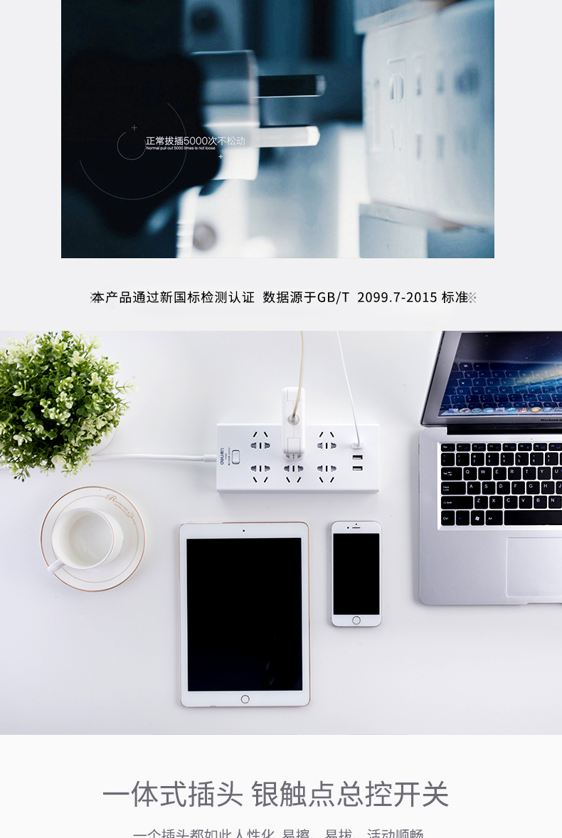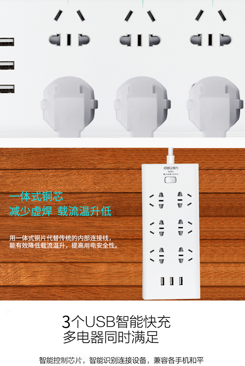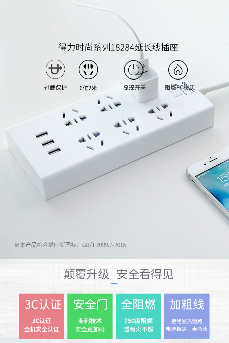 得力 18284 單控六聯(lián)拖線板插座+3USB 白色 2米