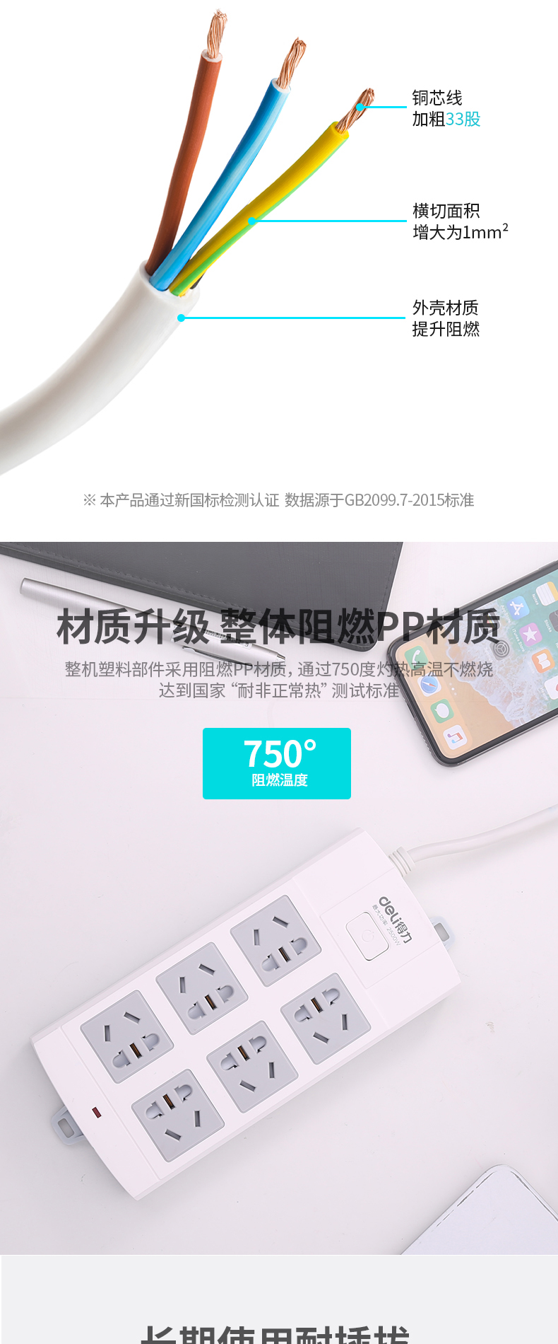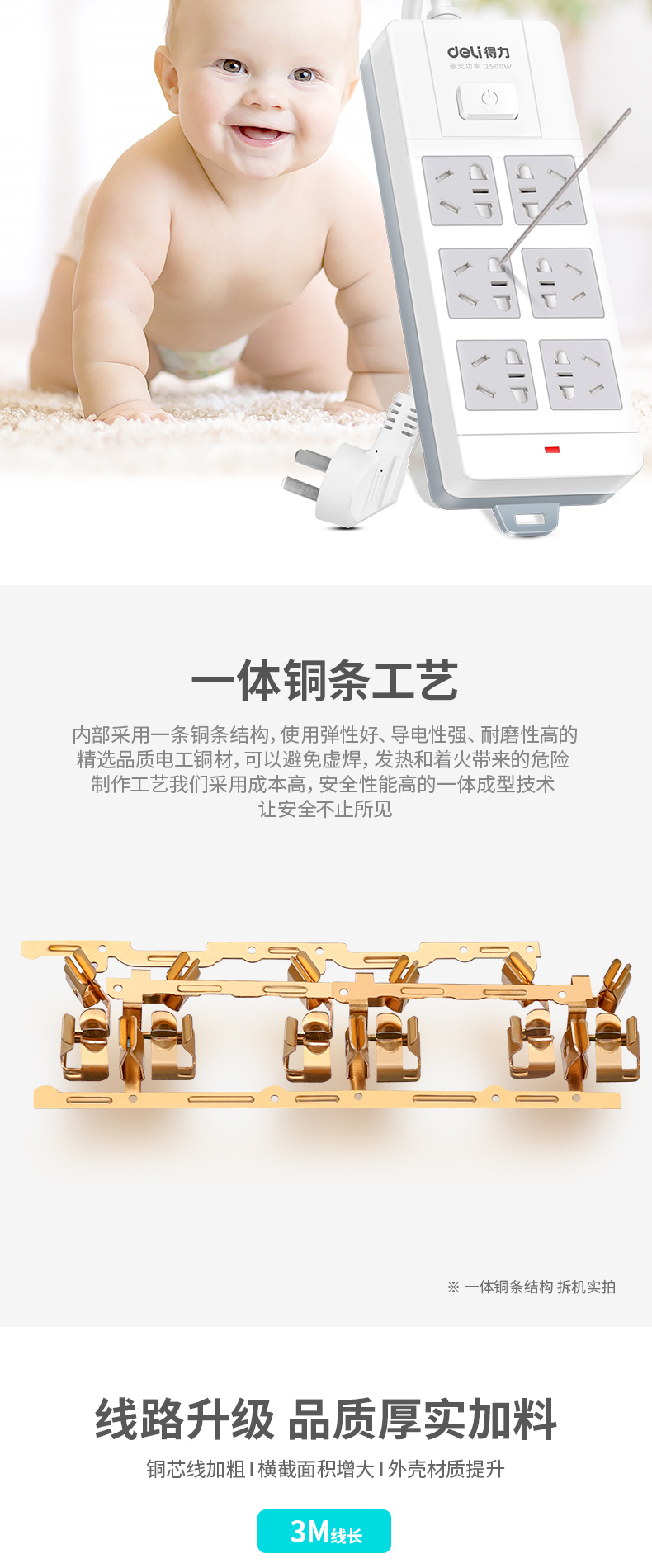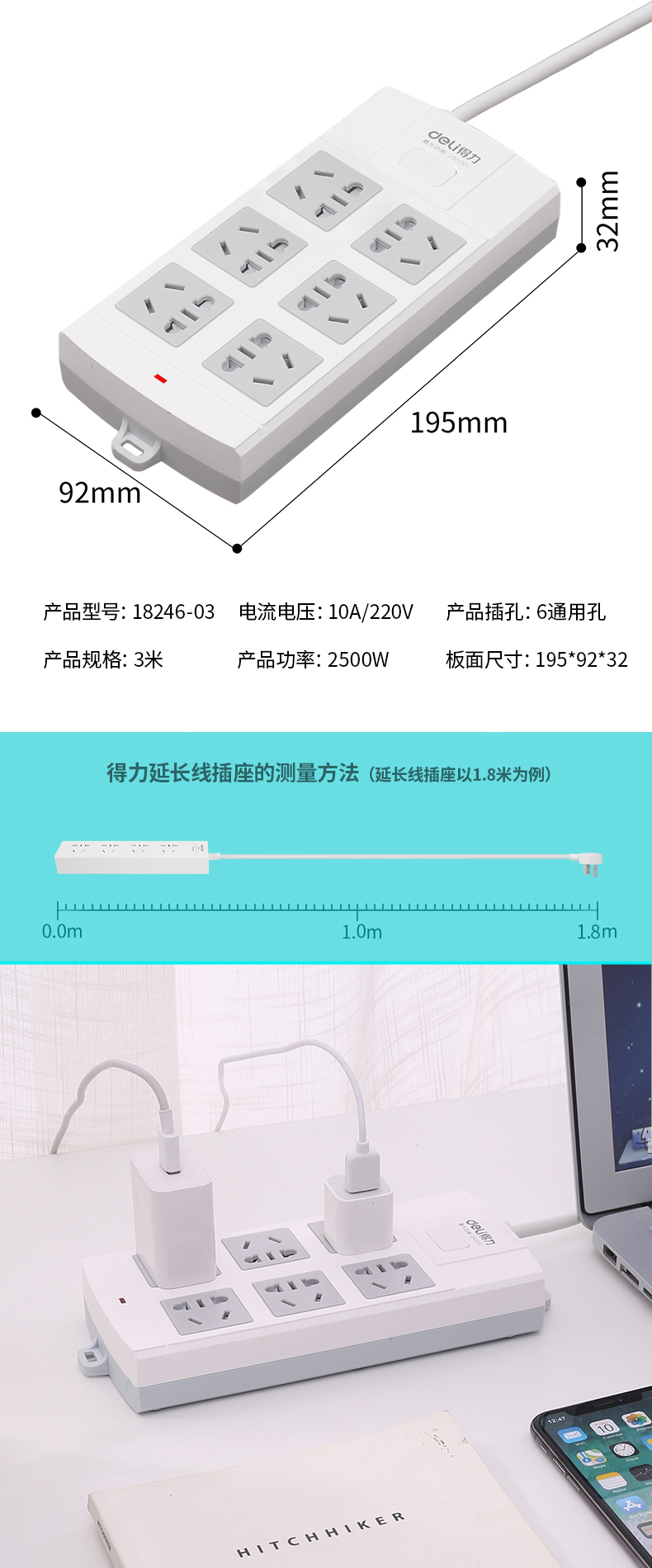 得力18246-03 單控六聯(lián)拖線板插座 3米 白色
