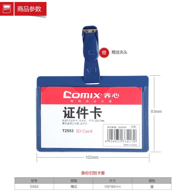 齊心 T2553 橫式證件卡套/胸卡套 99*67mm 混色 50個/包