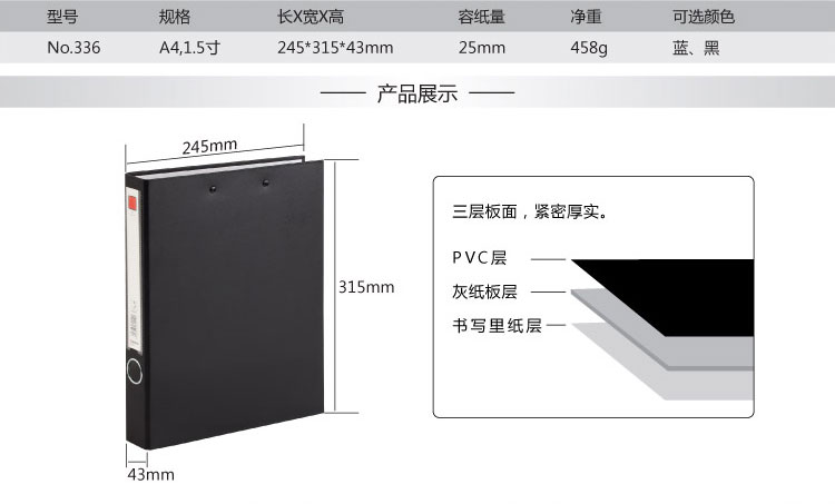 齊心(Comix) NO.336 2孔D型夾+板夾 A4 藍(lán)色 1.5寸