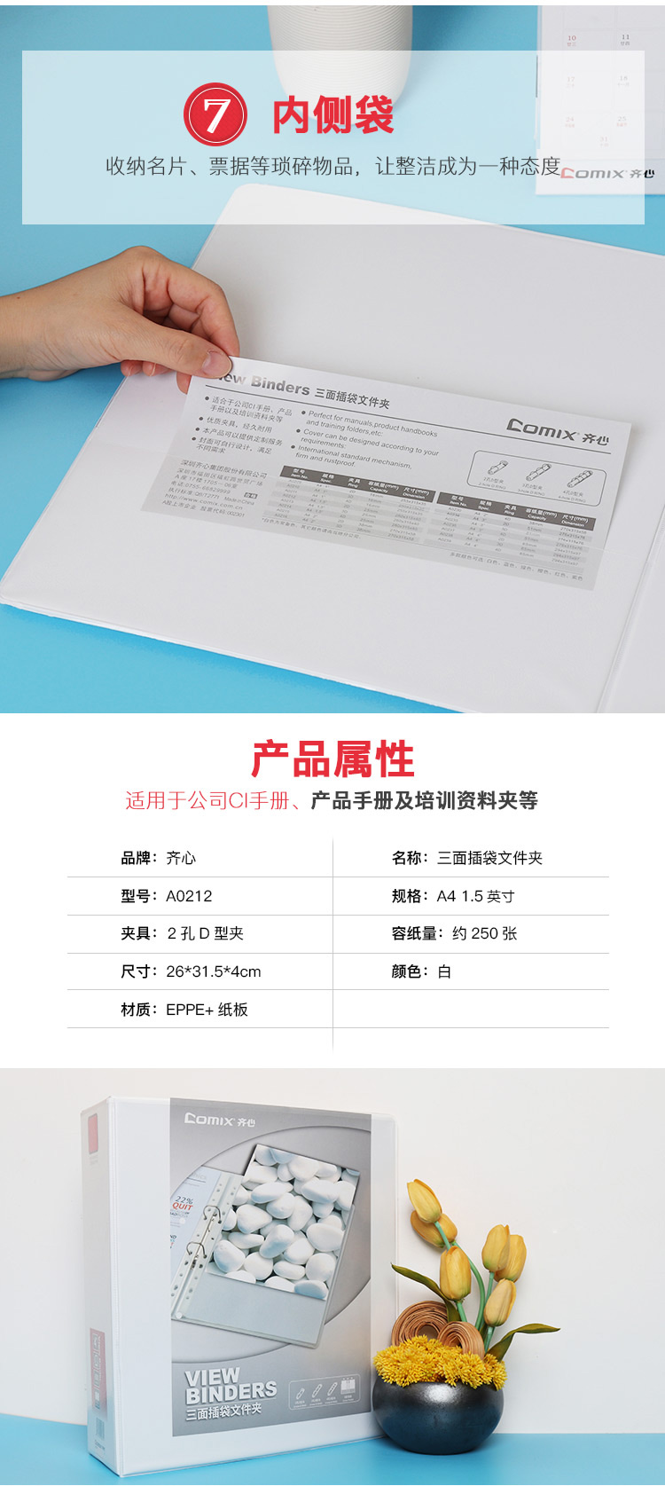 齊心(Comix)A0212 美式三面插袋2孔D型文件夾 A4 白色 1.5英寸