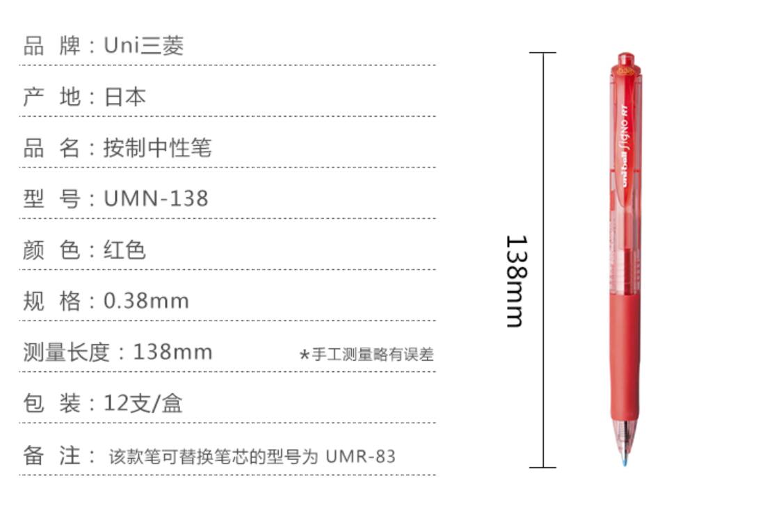三菱(Uni) UMN-138 按動中性筆 0.38mm 紅色 12支/盒