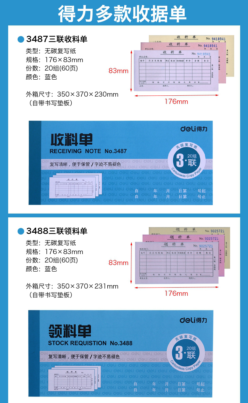 得力(Deli) 3488 三聯(lián)無碳復(fù)寫領(lǐng)料單 20組/本 藍(lán)色