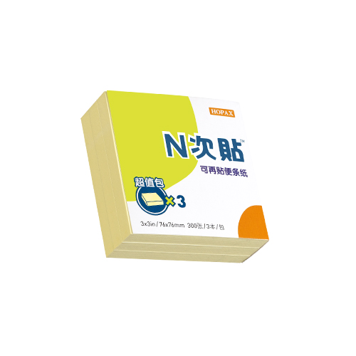 21年來N次貼都是由專業(yè)制造研發(fā)生產(chǎn)自粘性便條紙的技術公司聚和生產(chǎn),擁有獨家膠水,促使N次貼撕起來很輕,粘起來又牢,且被粘物無殘膠,也無任何刺激性氣味。 穩(wěn)定品質(zhì),豐富產(chǎn)品線,不同尺寸規(guī)格不同組合包裝,滿足不同所需。同類產(chǎn)品,N次貼性價比最高。 此產(chǎn)品用途廣泛,作為個人家庭及辦公企業(yè)不可缺的小貼士,多彩的顏色可隨心情而定,為生活增添多彩的樂趣。 還有由我司最先研發(fā)的PP指示貼,開創(chuàng)了除紙以外的新材質(zhì)便條,這種色彩鮮艷材質(zhì)透明不遮蔽文件,為辦公白領以及文件管理人員的貼心小幫手。 規(guī)格:76*76mm,300張,3本/包 包裝:72本/箱