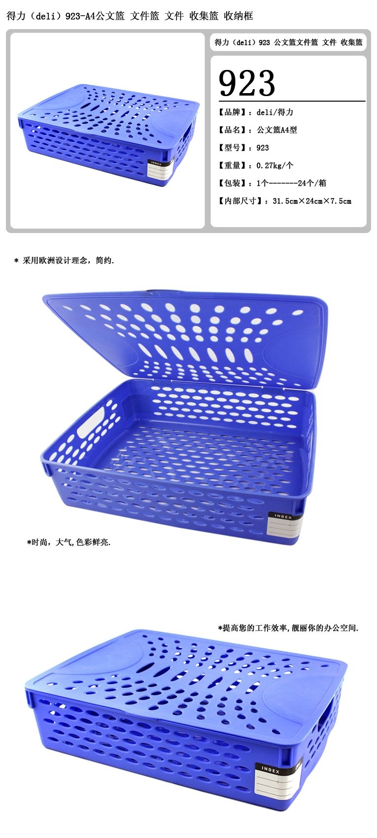 得力 923 加蓋公文籃 藍色